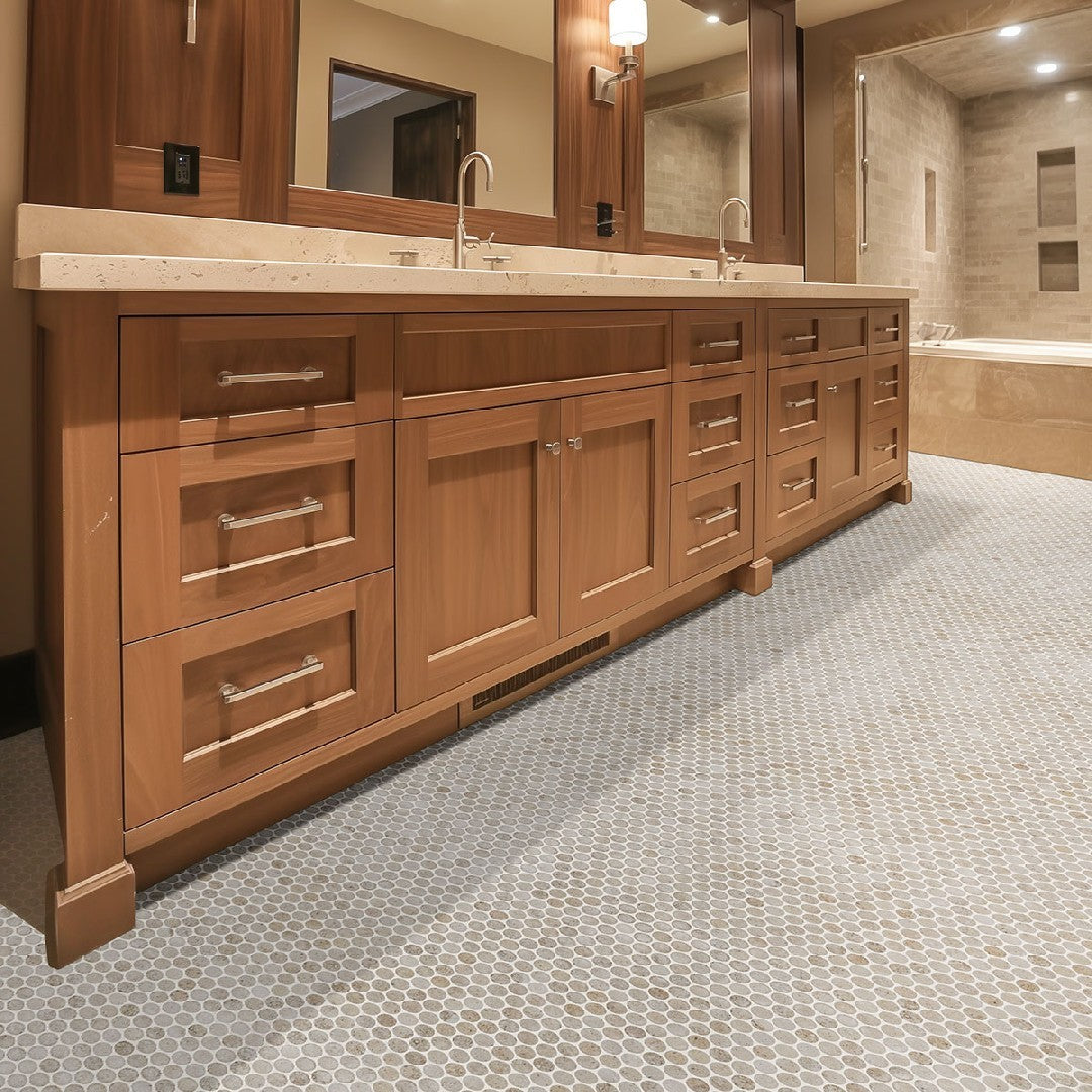 MS International Myrtle Sands 11" x 13" Matte Penny Round Porcelain Mosaic is a charming and versatile tile for both floors and walls. The classic penny round shape, finished in a soft matte finish, offers a nostalgic feel with a modern touch. This durable porcelain mosaic is perfect for creating unique backsplashes, shower floors, or feature walls, adding a playful yet sophisticated texture and color to your design.