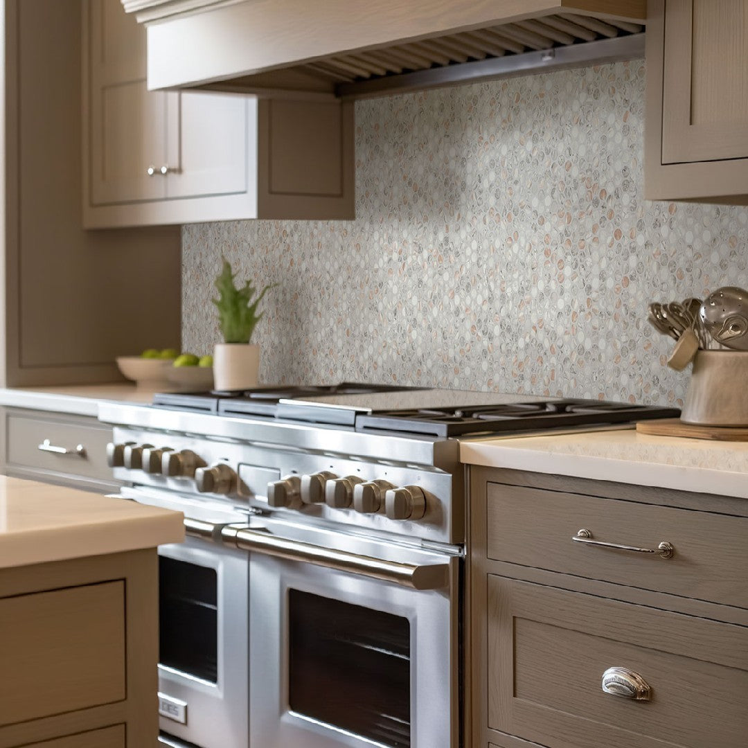 MS International Briar Rosa 12" x 12" Matte Penny Round Glass Mosaic adds a playful yet elegant texture to interiors. The soft matte finish and circular design make it a versatile choice for backsplashes, bathroom walls, or as an accent in a contemporary or vintage-inspired space.