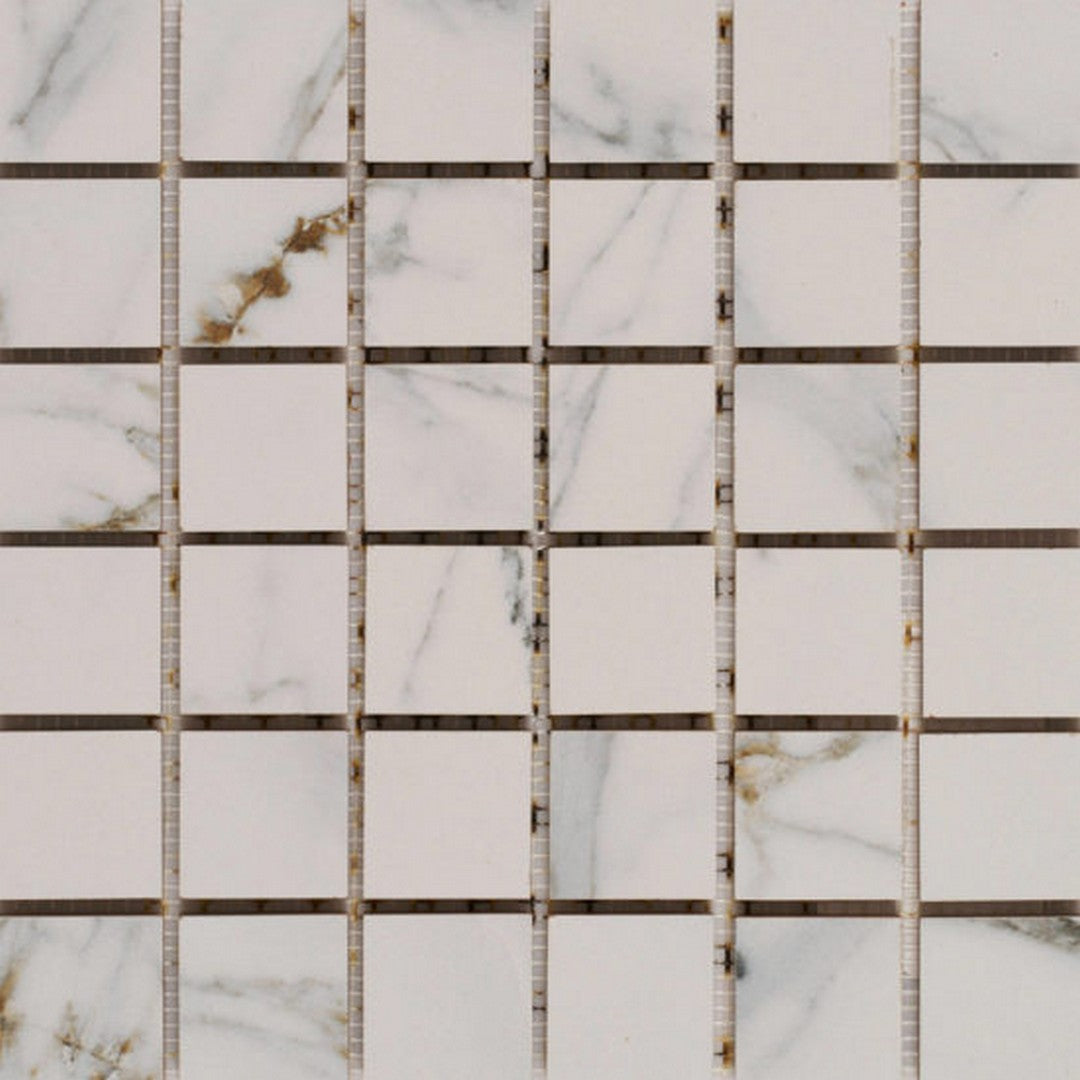 Alfagres 12x12 Carrara Hueso Gold Satin Ceramic 2 Mesh Mosaic allows you to add detailed design elements with smaller satin-finished tiles. Mounted on mesh sheets, these mosaics are easy to install and ideal for backsplashes, accent walls, or shower niches, offering a blend of elegance and convenience.
